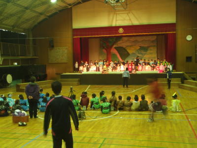 写真下:1年生の練習(舞台上)を見つめる2年生(手前 フロアー)