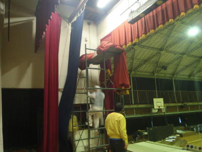 そんな中、11月7日(水)の練習時、舞台の緞帳(どんちょう・舞台上の一番前の幕)が、動かなくなってしまいました。