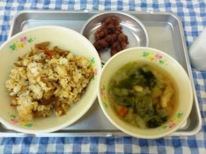 15日のこんだては、かてめし・具だくさんのみそ汁・金時豆の甘煮・牛乳でした。