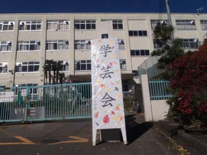 いつもの立て看板(写真上)の他、体育館の校庭側にも看板を設置しました。(写真中)