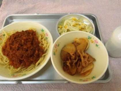 今日のこんだては、スパゲティーミートソース・根菜チップス・コールスローサラダ・牛乳です。