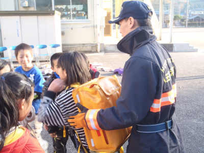 消防自動車が入れないところには、背中に水をしょって消火活動を行います。