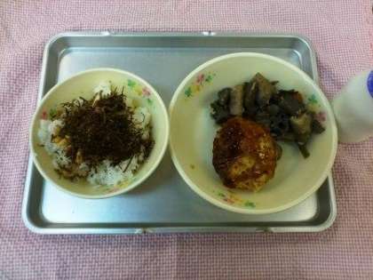 今日のこんだては、ごはん・ふりかけ・豆腐ハンバーグ・野菜のうま煮・牛乳です。
