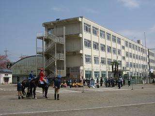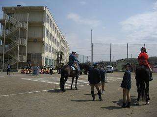 青空の下、馬も見守る中、1年生は一生懸命お話を聞こうとがんばりました。