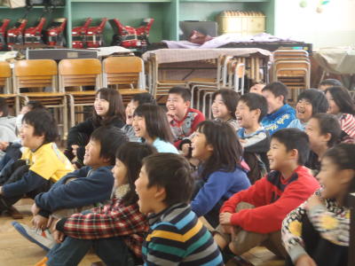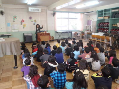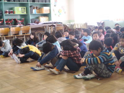 下:「目を閉じて聞くと良いですね。」素直に目を閉じて聞く3年生です。