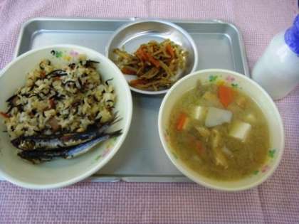 今日のこんだては、豆ひじきごはん・焼きいわし・味噌けんちん・ごま和え・牛乳です。