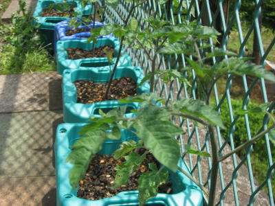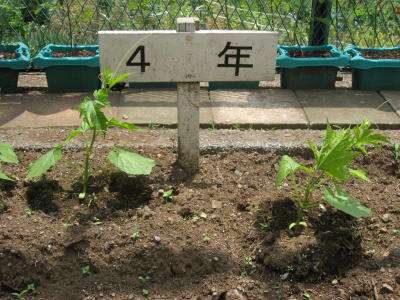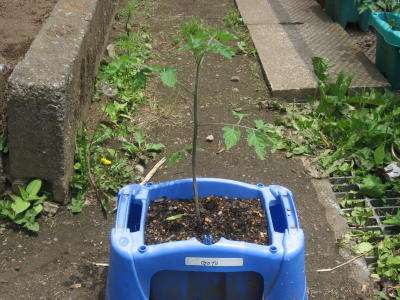 6月6日(日)校舎南側の学年・学級の花壇で、2年生のトマトの苗が植わった鉢を見つけました。
