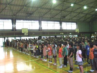 1学期最後の朝会は、雨天のため体育館での開催でした。