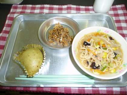 みそラーメン・小倉まっ茶蒸しパン・アーモンドフィッシュ・牛乳