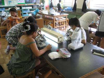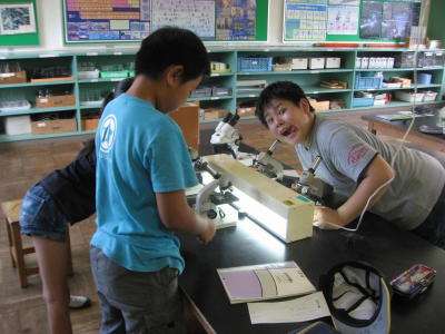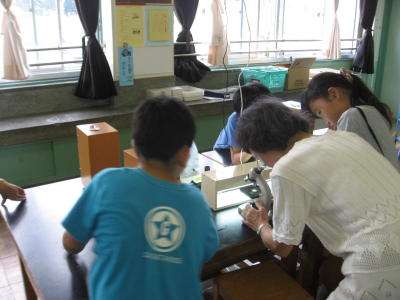 科学クラブは、顕微鏡を使って、いろいろなものを見ていました。