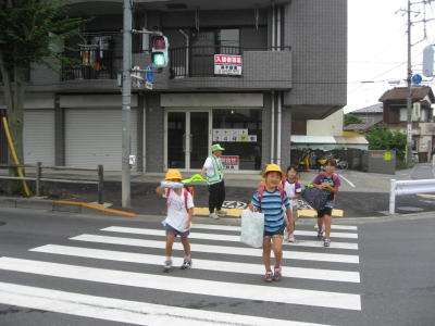 写真:川原宿交差店で毎朝児童を見守ってくださる木村さんと、元気に登校する恩一小児童。
