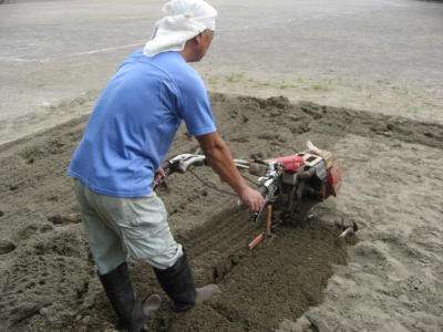 これは、陸上記録会に向けて砂場を使い始めました。スコップで掘り返してもたかが知れていて、苦労している6年担任の永弘主任教諭や山口教諭の姿を見て、大谷用務主事が耕運機を使って耕してくれたものです。
