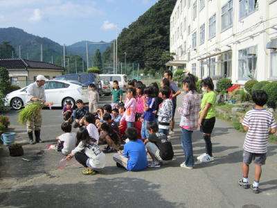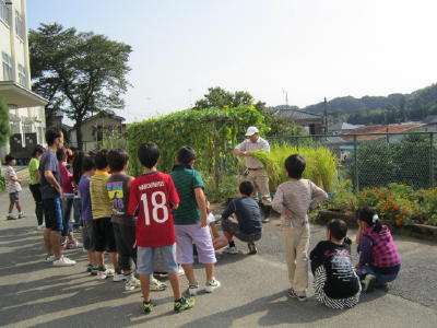 10月6日(水)1校時1組、3校時2組が、4月から育てていたバケツ稲の収穫をしました。