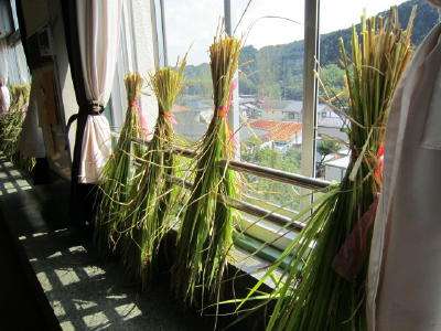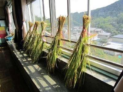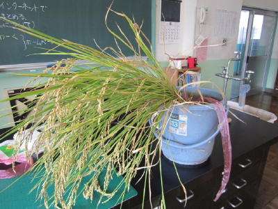 3時間目の2組の稲刈り時には、束ねた稲の束を、理科室に干すシーンを、HPでお知らせしようと計画していました。