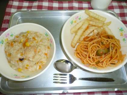 シーフードリゾット・スパゲティーナポリタン・フレンチポテト・牛乳