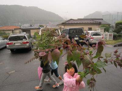 畑で大量のしそを収穫し、下ごしらえのため家庭科室へ。