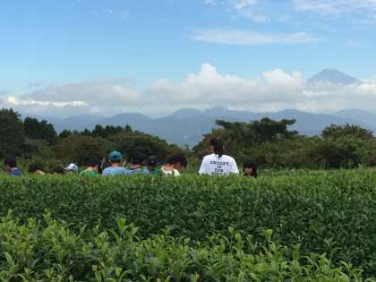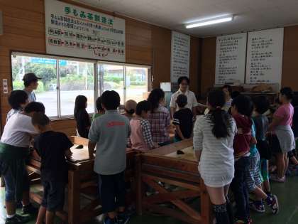 移動教室もいよいよ最後の体験、日本平で茶摘み、茶もみ体験です。お茶のいい香りの中一生懸命頑張っています。
