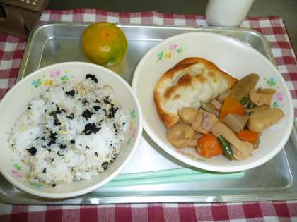 わかめご飯・焼きぎょうざ・ちくぜん煮・みかん・牛乳