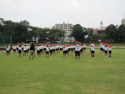荷物をスタンドに置いたら、さっそくフィールドに降りて、準備体操を始めました。(写真上)