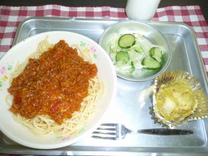 スパゲティーミートソース・さつまいもとりんごのオーブン焼き・牛乳