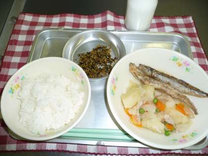 ご飯・ふりかけ・ししゃものから揚げ(2本)・塩肉じゃが・牛乳