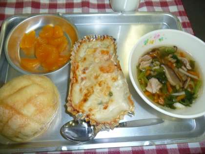 ミニメロンパン・えびドリア・春雨スープ・みかん缶・牛乳