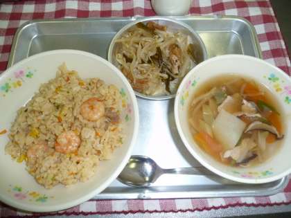 えびチャーハン・ワンタンスープ・もやしのナムル(茎わかめ入り)・牛乳