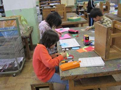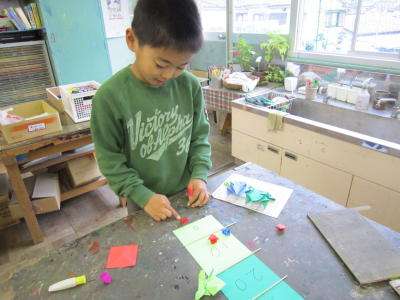 飛び出すカードを作ったり、糸鋸を使って木工を行う児童、設計図を元に脱出ゲームを作っている児童、折り紙を使ってゲームを作る児童、それぞれに楽しみました。