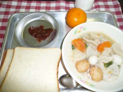 食パン・手作りチョコクリーム・洋風おでん・みかん・牛乳