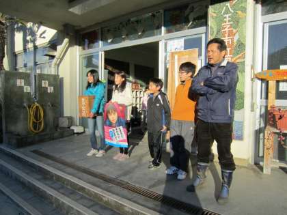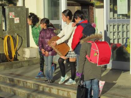 登校時間に東と西の昇降口で、児童会役員が募金を呼びかけています。