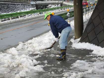 朝、7時に出勤すると、もう、歩道や、恩一小の正門までの道を、松竹町会長の長田さんが、雪かきをしてくださっていました。(写真中)