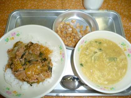 豚キムチ丼・コーンと青菜のスープ・ポップビーンズ・牛乳