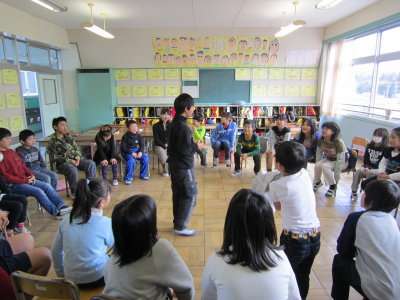 午前中から晴れはしましたが、雪の影響や、雨の影響で校庭のコンディションが良くないので校庭では遊べませんでした。室内での縦割り遊びとなりました。