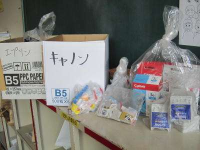 写真上:PTA会室に集められたベルマーク。エプソンとキャノンのインクジェットのインクもベルマークの対象となります。