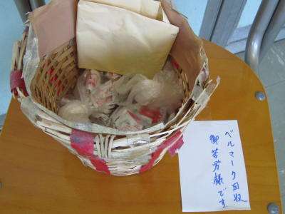 各クラス毎に集められたベルマークが、学年委員さんの手で、一つずつ種分けされ、集計されます。