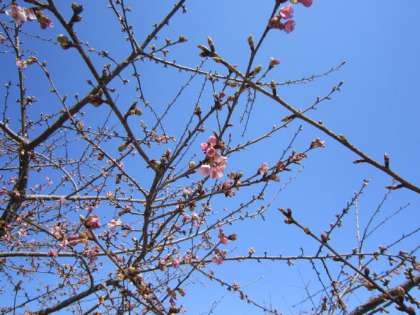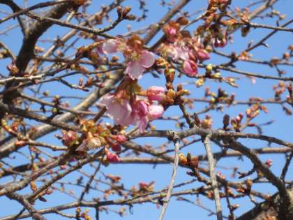 集合場所の小田野中央公園には、例年よりちょっと遅めですが、川津桜が咲き始めていました。