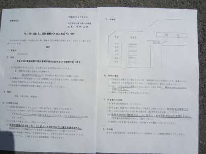 参考のため、今年春に行われました引き取り訓練の引き取り方法を、本HP、トップページ、学校からのお知らせ のところに「引き渡し訓練のお知らせ」として掲載しました。ご覧ください。