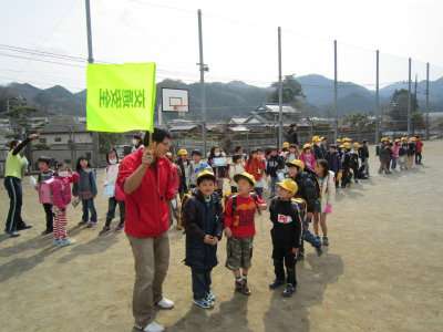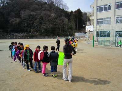 3月14日(月)13:25 1・2年生は、この日時間授業だったため、給食を食べた後校庭に集まりました。