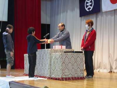写真下:記念品贈呈の場面。本番では蓑輪PTA会長に行っていただきます。