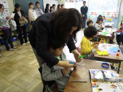 1組で参観中の保護者のみなさんは、教室の後ろで優しく見守り、児童はお手伝いなしでがんばっていました。