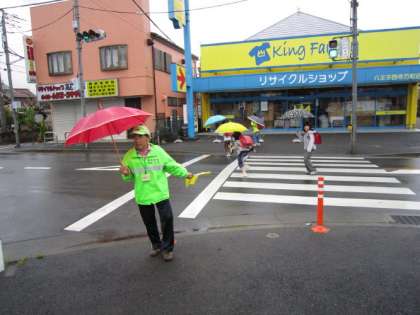 この地点にも二人の学校安全ボランティアさんがいて児童の登校を見守ってくださっていました。雨の中、本当にありがとうございます。