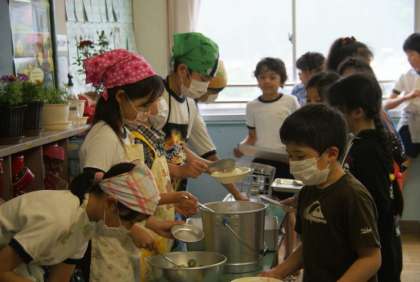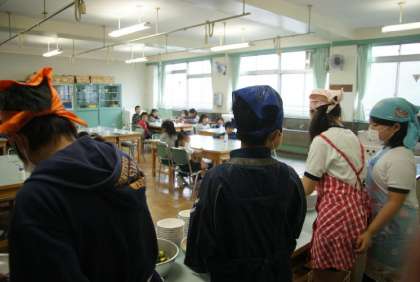 写真:配膳の様子。6年生がまるで、お父さん、お母さんのように見えますね。