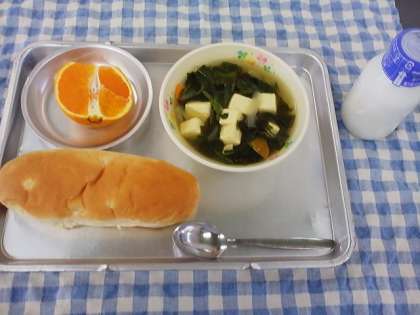 この日の献立は、パインパン・牛乳・くだもの(デコポン1/2コ)・わかめスープでした。