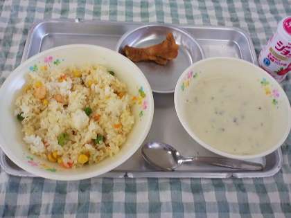 4月11日の献立は、エビピラフ・ウイングスティックの照り煮・ポテトポタージュ・ジョア(いちご味)でした。