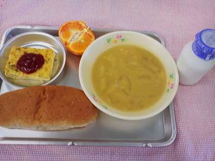 12日の献立は、セサミパン・クリームコーンスープ・オムレツ・くだもの(アンコール1/2コ)でした。