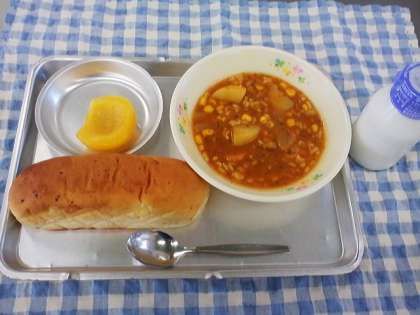 4月13日の献立です。この日も計画停電が予定されていたので、簡易給食にスープ類がつきました。この日の献立は、ダイスチーズパン・トマトシチュー・くだもの(黄桃1/2コ)・牛乳でした。ダイスチーズパンはとても好評でした。