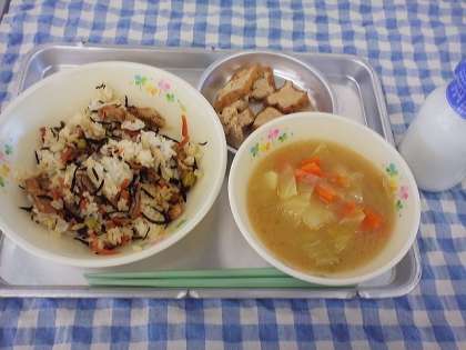 4月15日の献立は、ひじきと枝豆のごはん・どさん子汁・生揚げの煮物・牛乳でした。