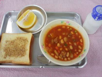 4月21日の献立は、セサミトースト・ポークビーンズ・くだもの(河内晩柑1/4コ)・牛乳でした。