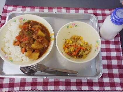 4月22日の献立は、カレーライス・ボイル野菜のごまドレ・牛乳でした。