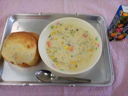 5月6日連休明けの献立は、手作りメロンパン・コーンシチュー・牛乳でした。